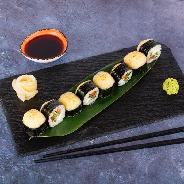 Orez, Nori, Brânză feta, Castraveți, Roșii, Ardei gras, Salată iceberg, Maioneză, Parmezan ras (8 buc.)